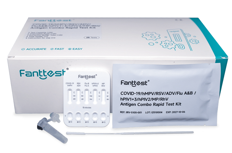 COVID-19/hMPV/RSV/ADV/Flu A&B/hPIV1+3/hPIV2/MP/RhV Antigen Combo Rapid Test Kit is a lateral flow immunoassay for the qualitative detection of COVID-19, respiratory syncytial, Adenovirus, M.pneumoniae, Rhinovirus, influenza A+B, Parainfluenza 1+3, Parainfluenza 2, human metapneumovirus antigens in nasopharyngeal swabs. The symptoms of respiratory viral infection due to COVID-19, respiratory syncytial, Adenovirus, M.pneumoniae, Rhinovirus, influenza A+B, Parainfluenza 1+3, Parainfluenza 2, human metapneumovirus can be similar. The test is intended as an aid in diagnosis of symptomatic individual meeting the case definition for COVID-19 in the first 7 days of symptom onset and meeting the case definition for respiratory syncytial, Adenovirus, M.pneumoniae, Rhinovirus, influenza A+B, Parainfluenza 1+3, Parainfluenza 2, human metapneumovirus in the first 4 days of symptom onset.